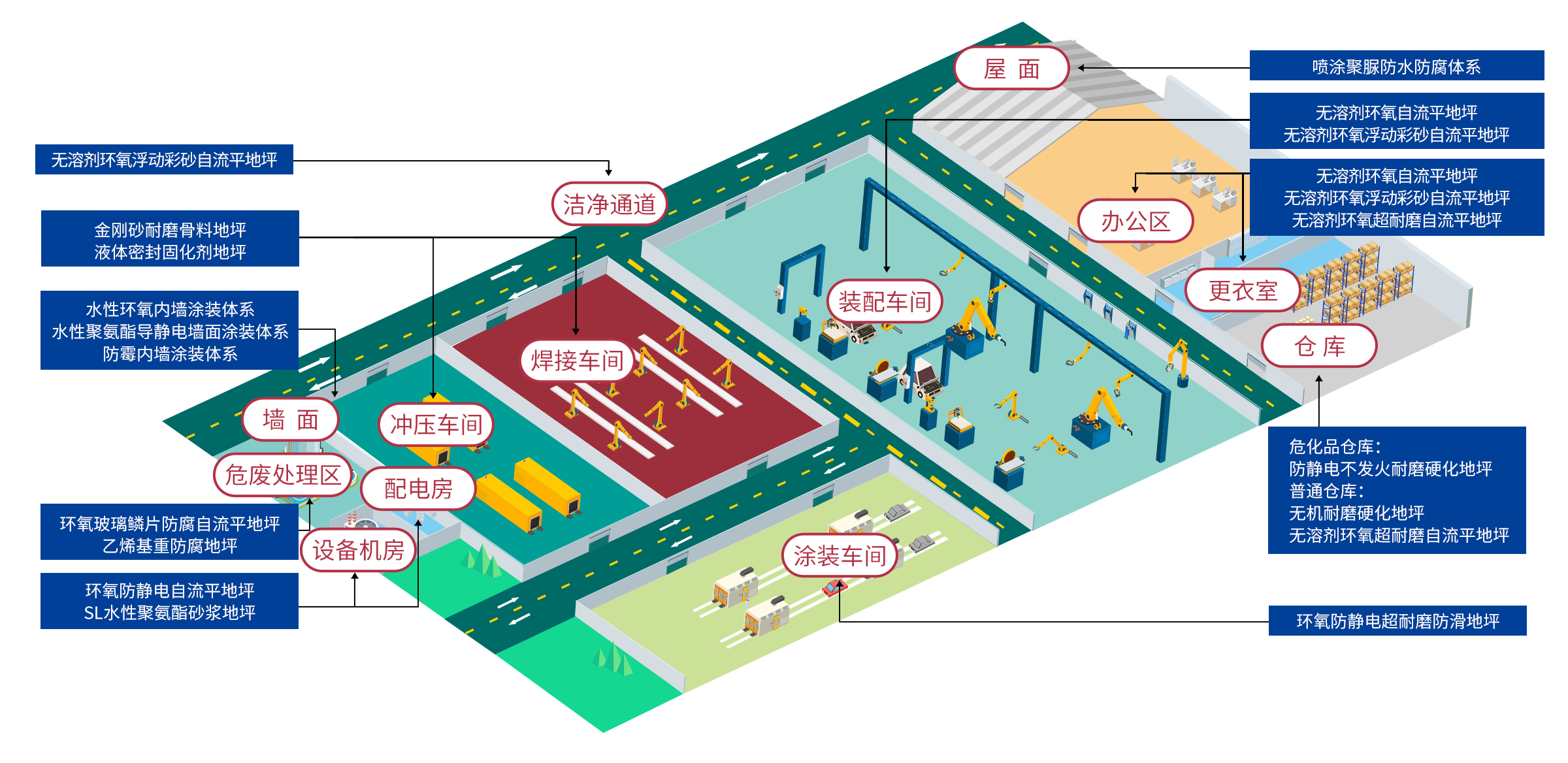 隨工業(yè)升級而來的智能制造工廠、高端裝備制造工廠,自動化程度越來越高,設(shè)備和產(chǎn)品對生產(chǎn)環(huán)境要求較好的潔凈度、工廠內(nèi)物料流通要求地面的高平整度和高抗壓耐磨度,配套的涂裝車間要求防靜電。