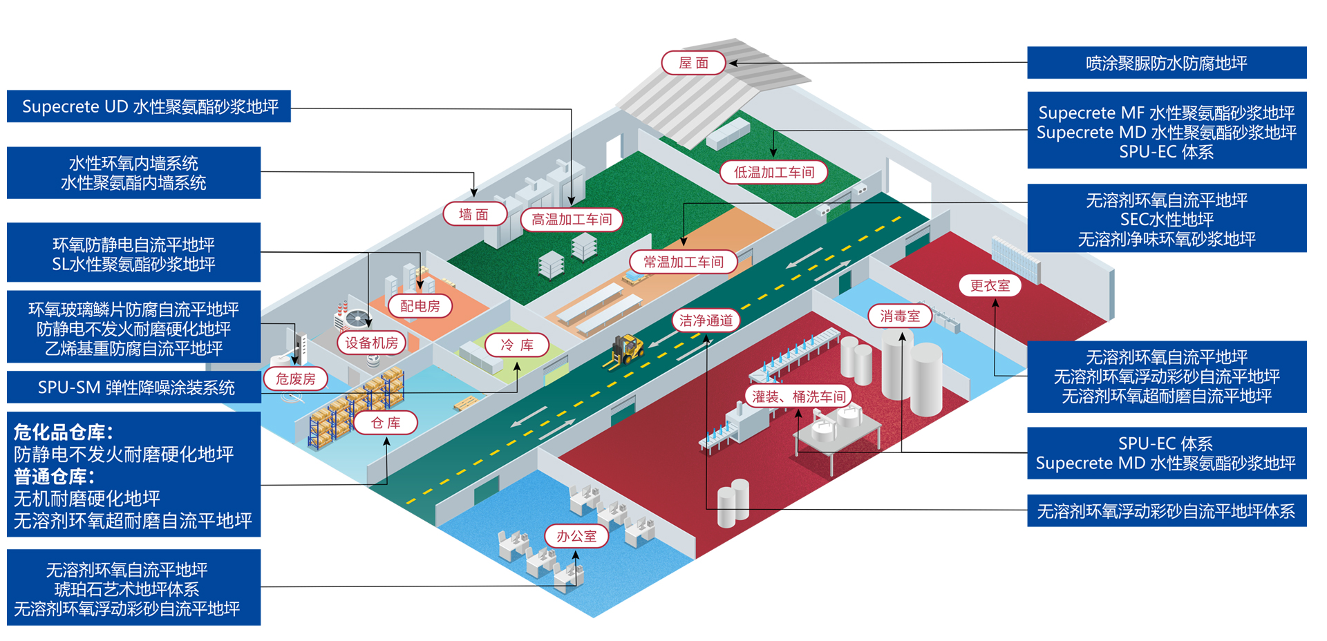 食品加工車間各類繁多,食品安全是第一標(biāo)準(zhǔn),使用的地坪材料要符合食品安全要求,不同的生產(chǎn)工藝對(duì)地面功能的要求也不一樣,有耐高低溫,耐乳酸,果酸腐蝕,耐水洗,耐高溫蒸汽等。
